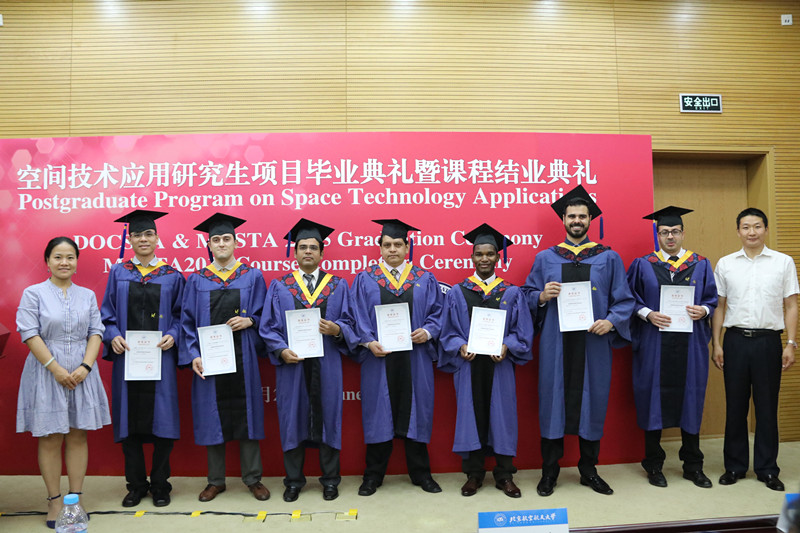 6月21日下午,空间技术应用项目2017届留学研究生毕业典礼暨课程结业仪式在北航新主楼会议中心第八会议室举行。亚太空间合作组织秘书长李新军、副秘书长Egemen Ozalp,工业和信息化部军民结合推进司以及国家航天局代表,北航国际学院负责人,联合国附属空间科技教育亚太区域中心(简称北航区域中心)教师代表等出席典礼。2017年6月毕业空间技术应用项目23名硕士研究生、1名博士研究生,以及完成课程学习、即将进入论文研究阶段的35名硕士研究生参加典礼。典礼由北航国际学院院长翁敬农主持。