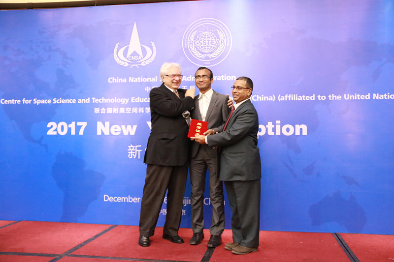 招待会上,还举行了“中心年度杰出贡献奖”和“中心年度优秀志愿者”的颁奖仪式,以对为中心发展作出突出贡献的老师和学员志愿者进行表彰。田玉龙秘书和徐惠彬校长为中心品牌设计师王鑫女士颁发了“年度杰出贡献奖”的荣誉证书和奖杯。成员国代表、巴西航天局局长黑蒙多先生和孟加拉国空间研究与遥感中心阿拉姆先生为中心学员蒙达尔颁发了“年度优秀志愿者”的荣誉证书和奖杯。