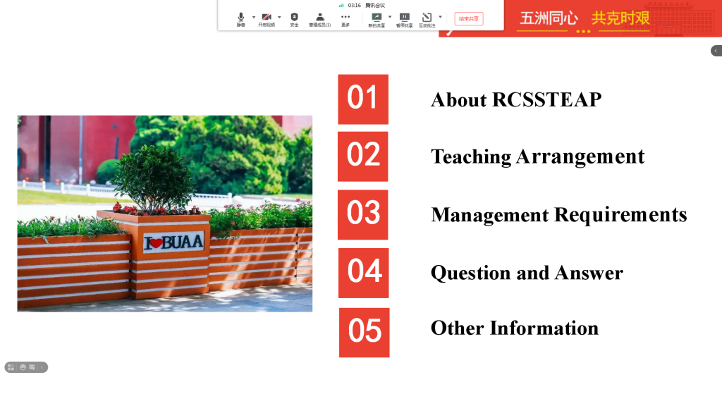 班会中,学员首先观看了区域中心宣传视频,对中心以及空间技术应用项目有了更深刻的了解。作为区域中心的新成员,2021级学员们进行了精彩的自我介绍,并表示期待早日来到中国学习、相聚。