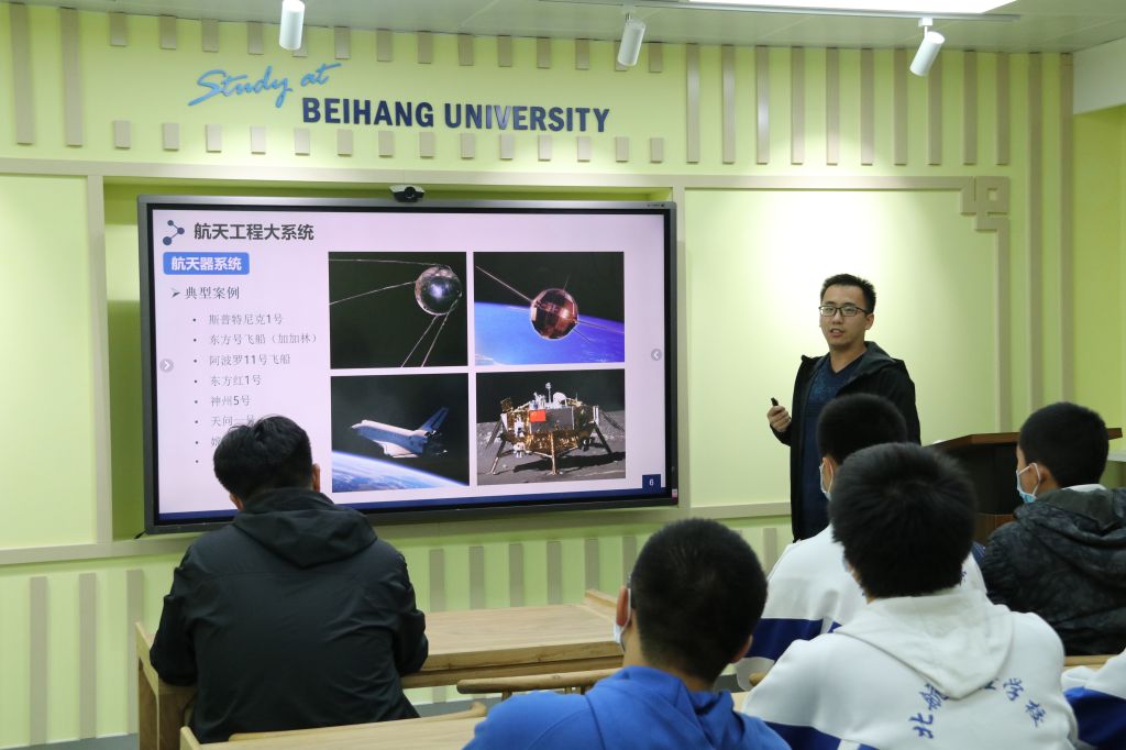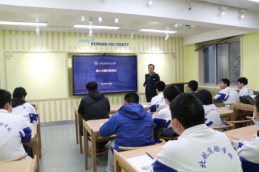 11月11日下午,首次科普活动在中心511教室和小卫星地面指挥控制中心进行。小卫星团队学生总师、北航宇航学院博士生赵旭瑞为来自北航附中航模社的20名高中生精心准备了一堂微小卫星科普课。课上,赵旭瑞从航天工程大系统、航天器系统、卫星研制过程(部分)三个方面循序渐进地向学生们科普了相关航天及微小卫星相关知识。结合APSCO-SSS-1的研制经历,用生动的视频和图画展示了一颗微小卫星从设计组装到发射运行的全过程。