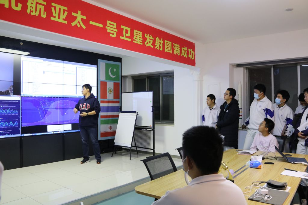 讲解结束后,同学们来到位于区域中心的小卫星地面指挥控制中心。小卫星团队的博士生李佳通过中心大屏幕向大家说明了当前卫星所在位置及运行轨迹,介绍了卫星各项遥测数据的含义,并展示了星上核心载荷盘绕式伸展臂的在轨展开图像。在场的学生们对这颗运行于517km的太阳同步轨道的小卫星充满好奇,并就小卫星的运行周期、寿命、功能等问题与团队代表进行了积极交流。