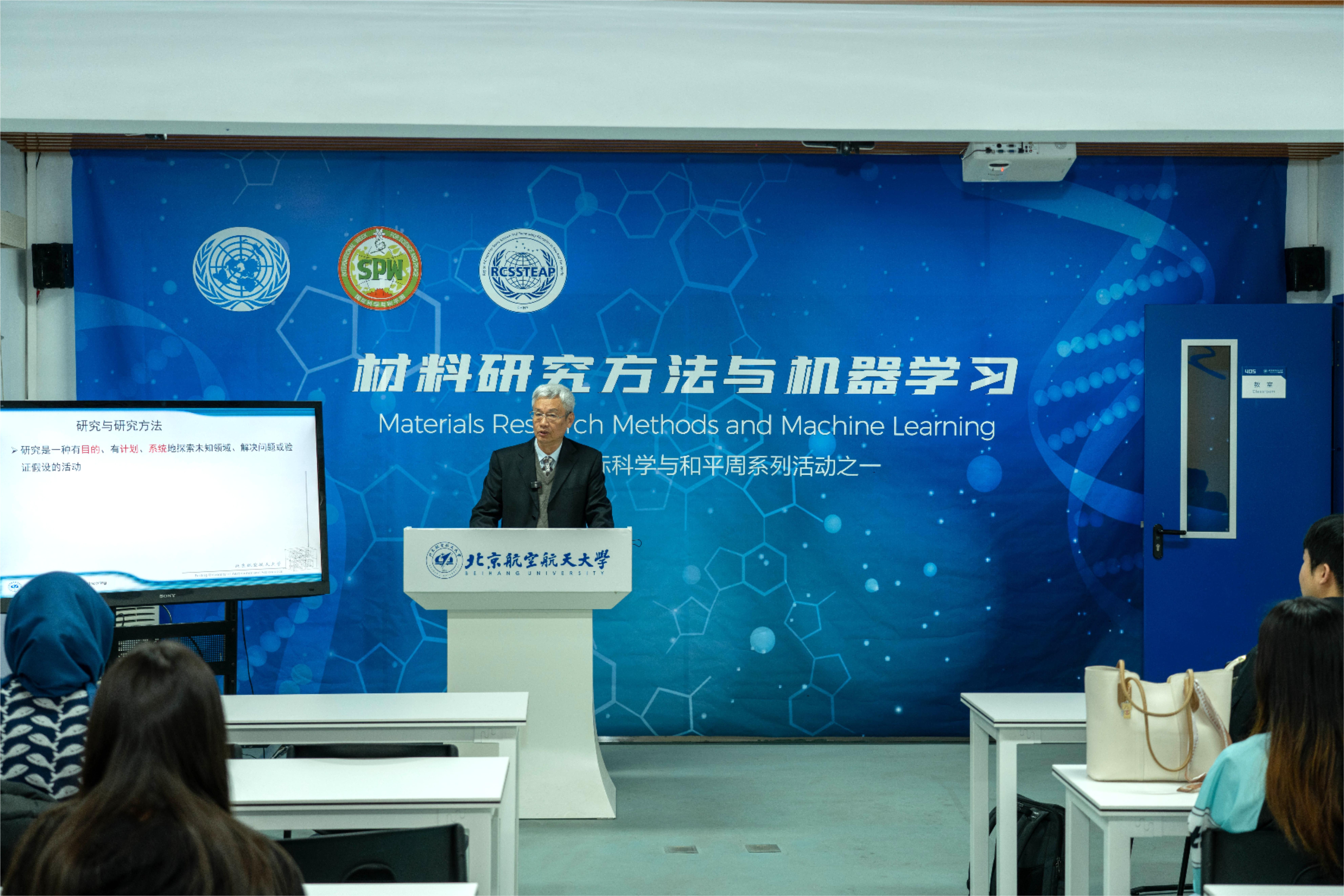 国际科学与和平周中国组委会秘书长陈一雄先生代表国际科学与和平周中国组委会为北航老教授协会和区域中心颁发了“优秀活动组织单位”奖牌及纪念证书,并发表讲话。他向在座的同学们介绍了和平周与科学日的起源,并表示材料问题至关重要,涉及诸多科学前沿问题。
